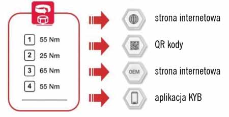 KYB zaleca stosowanie specjalnych narzędzi przeznaczonych do montażu amortyzatorów oraz używania właściwego momentu siły podczas dokręcania wszystkich połączeń gwintowanych zgodnie z zaleceniami producenta pojazdu.