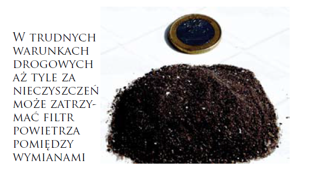 ściernych po mikroskopijne cząsteczki sadzy, gumy z opon, krzemionki, pyłu hamulcowego, pyłków i wilgoci. Na utwardzonych drogach zawartość pyłu w powietrzu wynosi 1 mg/m3, tak więc w trakcie eksploatacji pomiędzy wymianą filtr zatrzymuje około 10 gramów zanieczyszczeń. Natomiast na drogach zapylonych wartość ta rośnie znacząco, nawet 40-krotnie.