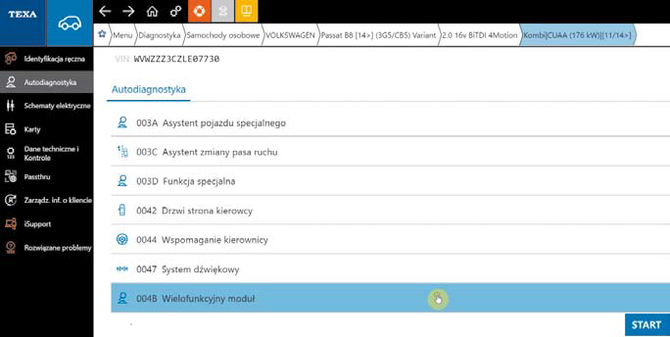 Kalibracje uruchamia się poprzez oprogramowanie diagnostyczne IDC5. Najpierw automatycznie dobiera się pojazd wykorzystując numer nadwozia, a potem wybiera sterownik: Moduł wielofunkcyjny 004B (fot. 2). Następnie należy kliknąć w zakładkę: Regulacje i wybrać: Podstawowa regulacja wysokości jazdy i tryb testowania reflektorów Matrix-LED (fot. 3).