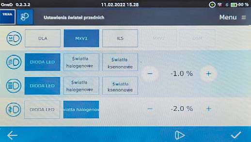 Procedura składa się z dwóch etapów. W pierwszym z nich należy prawidłowo ustawić światła mijania w pojeździe. Czynność ta nie różni się niczym od tego, co znamy choćby ze stacji kontroli pojazdów podczas przeglądu technicznego. Należy pamiętać, aby badany pojazd znajdował się na płaskiej równej powierzchni, a ciśnienie w ogumieniu oraz masa pojazdu odpowiadała danym technicznym producenta wymaganych podczas pomiaru. Przyrząd eLight powinien być ustawiony starannie względem pojazdu w odległości od źródła światła w przedziale od 10 do 50 cm. Do ustawienia wykorzystuje się dwa lasery: liniowy (pozwala ustawić eLight prostopadle do pojazdu) oraz krzyżowy (pozwala ustawić głowicę pomiarową idealnie względem źródła światła). Następnie należy uruchomić ustawiony przyrząd i po wybraniu rodzaju badanego oświetlenia oraz wprowadzeniu wartości spadku strumienia światła odczytanego z reflektora badanego pojazdu (fot. 4) przejść do pomiaru.