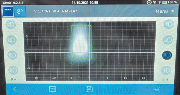 Na ekranie eLight pojawia się interface pomiarowy, gdzie dwie niebieskie przerywane linie wyznaczają zakres, w jakim powinna mieścić się granica światła i cienia dla mierzonego reflektora. Jeżeli reflektor ustawiony jest prawidłowo, to linia granicy światła i cienia zmieni kolor z czerwonego na zielony (fot. 5).