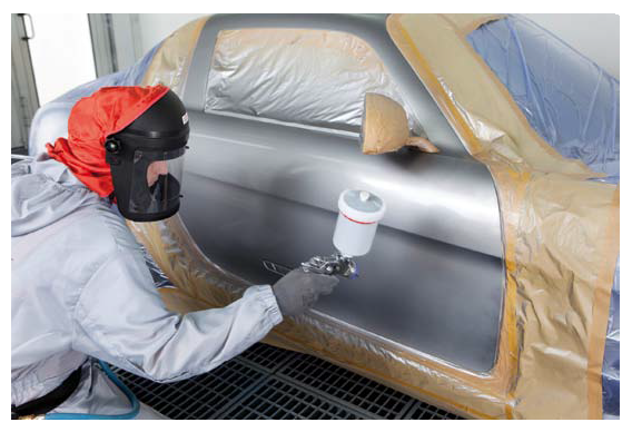 6) Na początek użyj podkładu o właściwym odcieniu, jak określono w recepturze koloru. Następnie przeprowadź aplikację lakieru bazowego. W zależności od tego, czy używasz systemu wodorozcieńczalnego czy konwencjonalnego marki Spies Hecker, musisz zapoznać się z arkuszem danych technicznych systemu Permacron® Matt Clear, ponieważ mogą występować różnice w procesie aplikacji lakieru bazowego. W przypadku stosowania Permahyd Hi-TEC 480 - najwyższej jakości wodorozcieńczalnego lakieru bazowego - należy pokryć lakierem cały obszar naprawy, w przeciwnym razie widoczne będą różnice w połysku.