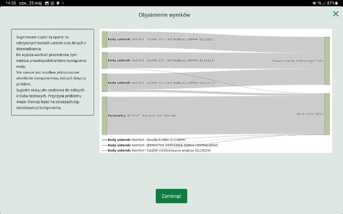 Wyniki automatycznej diagnozy przedstawiane są w przejrzysty i czytelny sposób wraz z objaśnieniami i proponowanym rozwiązaniem usterki