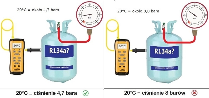 Stosunkowo prostym testem jest zbadanie zależności pomiędzy temperaturą i ciśnieniem czynnika chłodniczego w butli lub pojeździe. Korzystając z aplikacji Danfoss lub z suwaka Denso, można łatwo ustalić, czy zależność pomiędzy temperaturą a ciśnieniem czynnika chłodniczego jest prawidłowa. Prawidłowe ciśnienie czynnika chłodniczego w temperaturze 20oC wynosi ok. 4,7 bara.