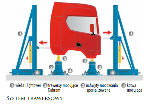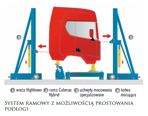 Niezależnie od wyboru systemu mocowania, we wszystkich przypadkach stosowane są te same wieże wysokiego ciągnięcia. Dobór osprzętu zależy wyłącznie od możliwości finansowych i aktualnych potrzeb. Optymalnie w każdym przypadku zestaw zawiera dwie wieże ciągnące system siłowników do napraw płyty podłogowej i komplet hydraulicznych narzędzi rozpierających. Niezbędne jest posiadanie zestawu uchwytów do mocowania kabin do ramy, jak i blacharskich uchwytów ciągnących, mocowanych do karoserii kabiny.