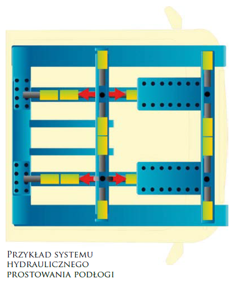 Urządzenie do napraw kabin będące połączeniem systemu ramowego i trawersowego dodatkowo wyposażone jest w hydrauliczny system naprawy płyty podłogowej.