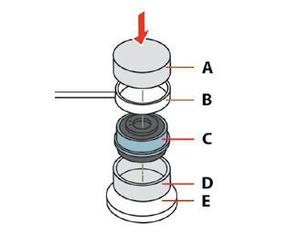 9. Wprasowanie nowego wkładu do gniazda cięgna: A – prasa, B – ramię cięgna, C – nowy wkład, D – tuleja pomocnicza, E – podkładka.