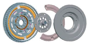 Aby wyposażyć tę koncepcję napędu w skuteczne tłumienie koła zamachowego, opracowano DMF z płytą napędową. Płyta napędowa stanowi adapter uformowany z blachy stalowej, przynitowanej do DMF w zwykłych punktach mocowania. Podobnie jak przemiennik momentu obrotowego w automatycznej skrzyni biegów, jest ona przykręcona do zewnętrznego promienia tarczy sprzęgła po stronie silnika.