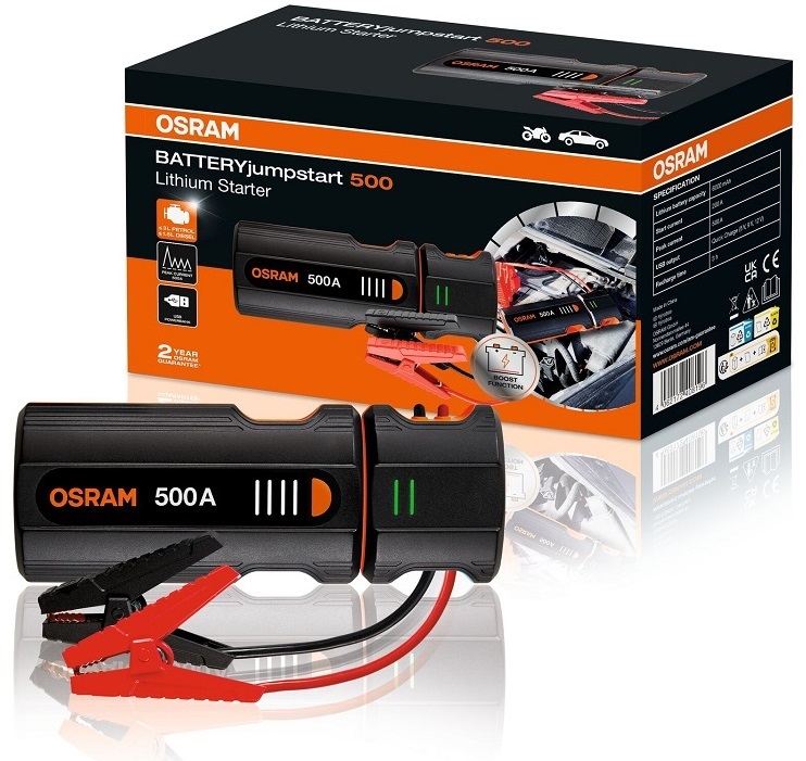 Osram BATTERYjumpstarter 500 pozwala uruchomić silnik benzynowy o pojemności do 3 l i wysokoprężny do 1,5 l, a wbudowany akumulator ma pojemność 6000 mAh. Prąd rozruchowy wynosi 200 A, a przypadku wykorzystania funkcji „Boost”, do całkowicie rozładowanego akumulatora - nawet 500 A. Urządzenie jest zabezpieczone przed odwrotnym podłączeniem biegunów, co zapobiega uszkodzeniu akumulatora.