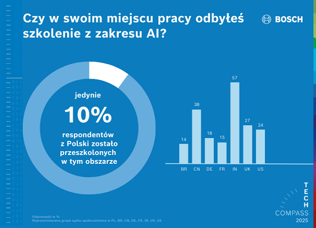 Ukończenie szkoleń z obszaru AI w pracy deklaruje jedynie 10% polskich badanych. Stanowi to wyraźny kontrast - szczególnie w zestawieniu z krajami Azji: odbycie takich szkoleń zadeklarowało 57% respondentów z Indii i 38% z Chin. Jednocześnie w Polsce aż 64% osób zamierza samodzielnie poszerzać swoją wiedzę z zakresu sztucznej inteligencji.