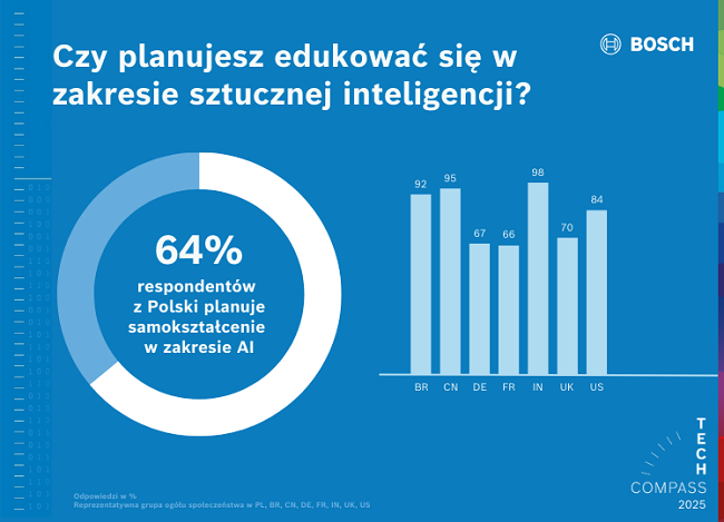 Badanie opinii przygotowane zostało na zlecenie firmy Bosch. Pokazuje ono jakie są relacje społeczeństw z technologiami. W tym roku pierwszy raz badano również respondentów z Polski. Oceniamy wpływ technologii na świat raczej pozytywnie. Aż 63% Polaków zgadza się ze stwierdzeniem, że postęp technologiczny czyni świat lepszym, co jest wynikiem plasującym się nieco poniżej średniej dla pozostałych siedmiu badanych krajów (69%). Największy optymizm w tym względzie panuje w Indiach (84%) i Chinach (88%).
