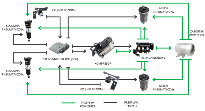 Gdy czujniki poziomu wykryją odchyłkę wysokości pojazdu od założonej, sterownik zawieszenia aktywuje kompresor. Sprężone powietrze płynie przez blok zaworowy (rozdzielacz) i dalej przewodami do odpowiednich sprężyn powietrznych. Jeśli w układzie występuje zasobnik ciśnienia, sprężone powietrze zwykle pochodzi z niego, a sprężarka dba o odpowiednie ciśnienie w zbiorniku.