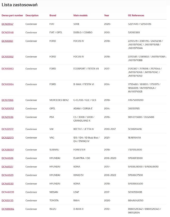 Rozszerzenie składa się z 19 skraplaczy, 9 chłodnic, 2 dmuchaw kabinowych, 1 wentylatora chłodnicy i 1 rdzenia nagrzewnicy. Nowe części mają łącznie 1004 zastosowania, m.in. w pojazdach marek Fiat, Hyundai, Lexus, Nissan, Peugeot, Renault i VW. Szczegółowe informacje o nowych częściach i pełna lista zastosowań są już dostępne w e-katalogu Denso i w katalogu TecDoc. Przykładowe zastosowania można znaleźć w poniższej tabeli: