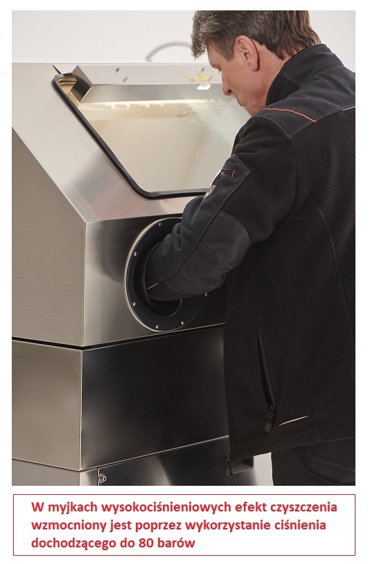 Mewa oferuje tę technologię w postaci stołów do czyszczenia w dwóch rozmiarach, zaopatrzonych w pędzel czyszczący, a także jako myjki wysokociśnieniowe. Te ostatnie są szczególnie przydatne, gdy trzeba wyczyścić większą ilość silnie zabrudzonych części lub też części o bardzo skomplikowanych kształtach. W tym przypadku działanie płynu czyszczącego jest intensyfikowane przez ciśnienie dochodzące do 80 barów, przy temperaturze czyszczenia wynoszącej około 40oC. Sprawdza się to doskonale wszędzie tam, gdzie wykonywane jest frezowanie, wiercenie lub toczenie.