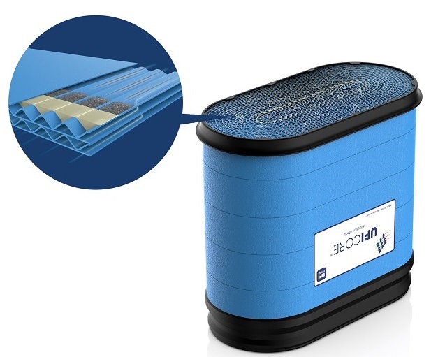 Filtr UFICore ma konstrukcję, która pozwala na większą wydajność filtracji powietrza przy niższym spadku ciśnienia. Struktura medium filtracyjnego składa się z systemu zamkniętych i otwartych kanałów z falistym rowkiem, który kieruje strumień powietrza w stronę obudowy filtra, gdzie jest on przekierowywany przez zamkniętą nasadkę końcową do sąsiedniego kanału. W ten sposób czyste powietrze dociera do układu dolotowego silnika, a straty prędkości i ciśnienia są zminimalizowane. Ta specjalna technologia pozwala zmniejszyć rozmiar filtra nawet o 40% w porównaniu z tradycyjnymi rozwiązaniami opartymi na plisowanych mediach filtracyjnych, a także zmniejsza jego wagę i ułatwia ich montaż.
