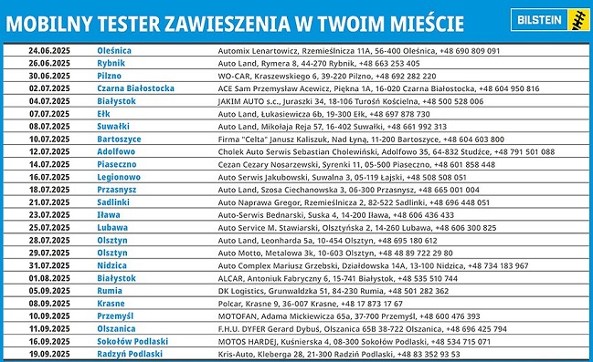 Po inauguracji w trakcie Camp Jeep PL akcja marki Bilstein ruszy w trasę po Polsce, a zaplanowane są przystanki w ponad 20 miejscowościach. Camp Jeep PL może być idealnym miejscem do rozpoczęcia sezonu testowego. Uczestnicy zlotu, poruszający się w wymagającym terenie, będą mogli przekonać się, jak ogromną rolę odgrywa sprawne zawieszenie - nie tylko dla komfortu, ale przede wszystkim dla bezpieczeństwa. Dzięki obecności w Jeep Village mobilny tester będzie dostępny przez cały czas trwania imprezy. Diagnostykę uzupełni prezentacja produktów i technologii zawieszeń Bilstein - od serii OE po sportowe systemy dla napędów 4x4.