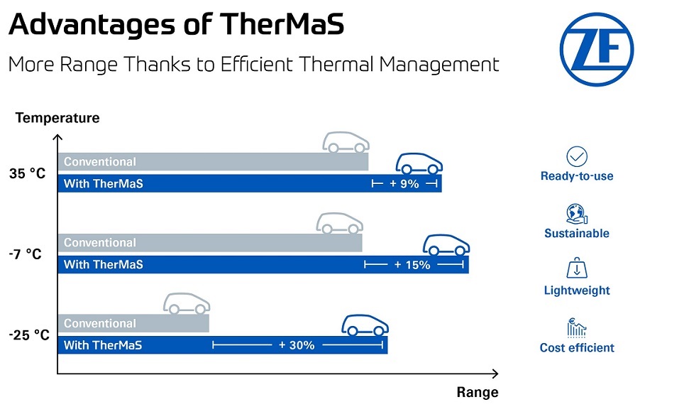 Aby poprawić wydajność napędów elektrycznych, a tym samym zwiększyć akceptację elektromobilności, firma ZF stosuje holistyczne podejście do innowacji. Jednym z nich jest TherMaS, system zarządzania temperaturą, który firma ZF opracowała specjalnie dla pojazdów w pełni elektrycznych. Zastosowanie propanu jako czynnika chłodniczego zapewnia znacznie lepszą wydajność termiczną w wysokich i niskich temperaturach, a także mniejszą i lżejszą konstrukcję systemu. W testach zoptymalizowane zarządzanie temperaturą i bardziej efektywne wykorzystanie ciepła odpadowego z układu napędowego zwiększyły zasięg elektryczny w wymagających warunkach zimowych nawet o 10 procent, a w ekstremalnych warunkach nawet o 30 procent.