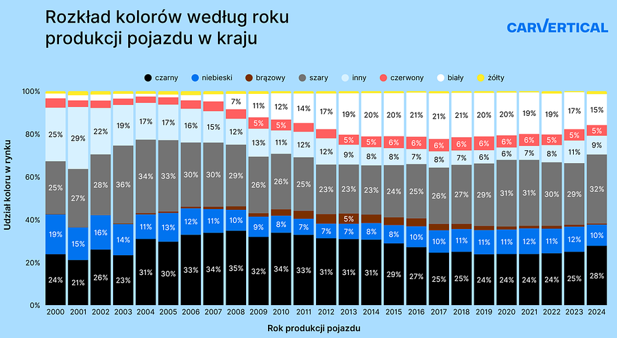 W badaniu carVertical przeanalizowano raporty dotyczące historii pojazdów zakupione przez klientów firmy w okresie od sierpnia 2023 r. do sierpnia 2025 r. Kolory samochodów zostały pogrupowane według roku produkcji i uszeregowane według popularności.