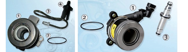 Po lewej: Części układu wysprzęglania: 1. wysprzęglik, 2. uszczelka kołnierza skrzyni biegów, 3. przewód ciśnieniowy, 4. przelotka chroniąca przewód