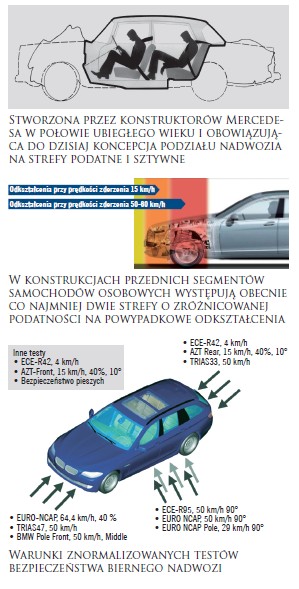 Koncepcja podziału samonośnego nadwozia na strefy podatne (przedział silnikowy oraz komora bagażnika) i sztywne (przedział pasażerski) została opracowana przez konstruktorów Mercedesa w połowie ubiegłego wieku. Zgodne z nią wykonanie poszczególnych elementów kadłuba samochodowego było efektem teoretycznych obliczeń, sprawdzanych niemal od początku w praktycznych testach. Polegały one na badaniu rzeczywistych skutków zderzenia odpowiednio rozpędzonego pojazdu ze sztywną przeszkodą. Wyniki tych prób stały się bardziej reprezentatywne, gdy w testowanych samochodach zaczęto umieszczać manekiny i za ich pomocą rejestrować potencjalne skutki tych symulowanych wypadków drogowych dla uczestni- czących w nich ludzi.