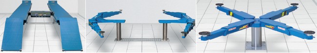 Podnośniki elektromechaniczne, od lewej: mobilne (jednokolumnowy Werther, dwukolumnowy Dannmar Maxjax) oraz stacjonarny, czterokolumnowy BendPak