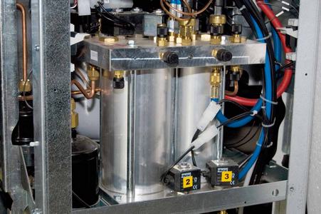 Zespół odzysku czynnika chłodniczego R134a (z lewej) i wewnętrzny zbiornik przepracowanego czynnika |
