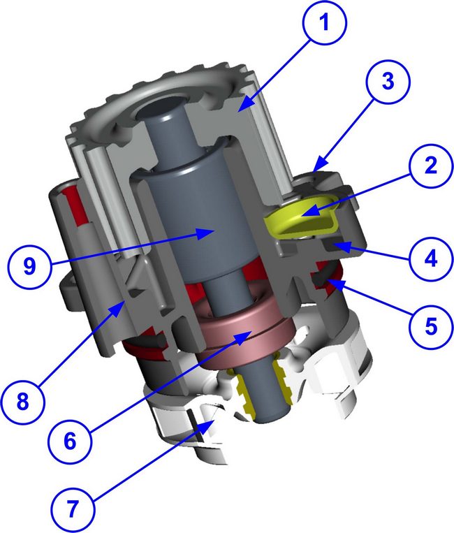 i zamkniętym wirnikiem: 1. koło pasa zębatego; 2. zaślepka zbiornika wycieków; 3. gniazdo śruby mocującej; 4. zbiornik wycieków z uszczelki wału; 5. pierścieniowa uszczelka korpusu; 6. uszczelka wału wirnika; 7. wirnik typu zamkniętego; 8. korpus; 9. zintegrowane łożysko wału.