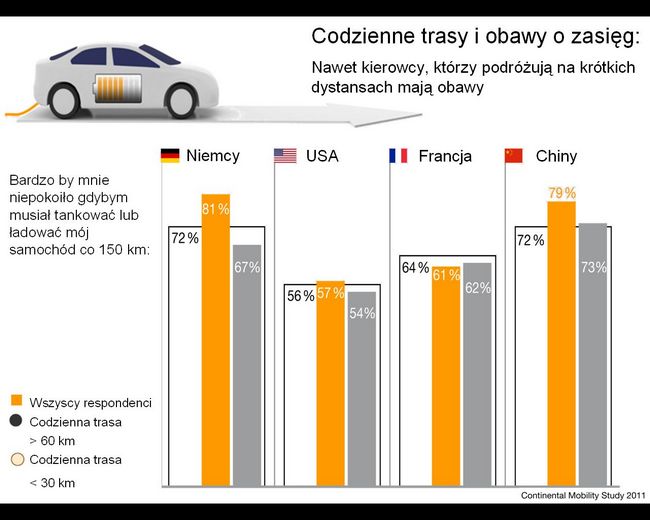 Z badania przeprowadzonego przez Continentala wynika, że więcej osób jest zainteresowanych nabyciem auta elektrycznego w przyszłości . Wśród odpytywanych Niemców 27 procent „prawdopodobnie” lub „zdecydowanie” kupi samochód tego typu. To samo dotyczy 29 procent Amerykanów, 10 procent Francuzów i aż 65 procent Chińczyków. Mimo to kierowcy nie wierzą, że e-samochody będą wykorzystywane do codziennej jazdy przed rokiem 2020.