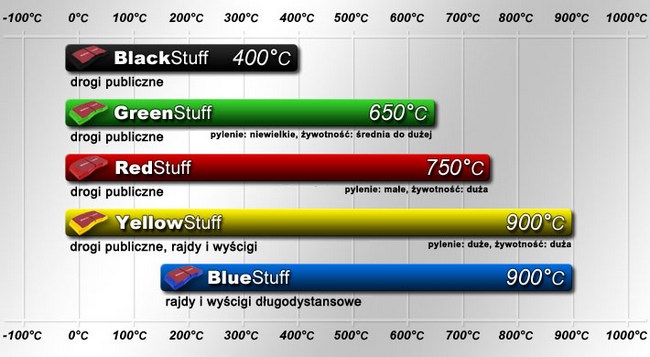 Firma EBC Brakes oferuje klocki i tarcze pozwalające uniknąć wielu typowych problemów z hamulcami. W przypadku klocków szczególnie ważna jest ich odporność na wysokie temperatury. Dlatego firma EBC Brakes stosuje w nich pięć rodzajów mieszanek ciernych oznaczonych różnymi kolorami. W pojazdach najsłabszych i najwolniejszych używane mogą być klocki czarne (Black Stuff). Do samochodów o niewielkiej mocy przeznaczona jest seria zielona (Green Stuff). Do mocniejszych, w granicach 200-250 KM –czerwona (Red Staff), a przy mocy powyżej 250 koni zaleca się okładziny o bazie organicznej (Yellow Stuff). Jest w firmowej ofercie też seria niebieska (Blue Stuff) opracowana z myślą o samochodach sportowych.