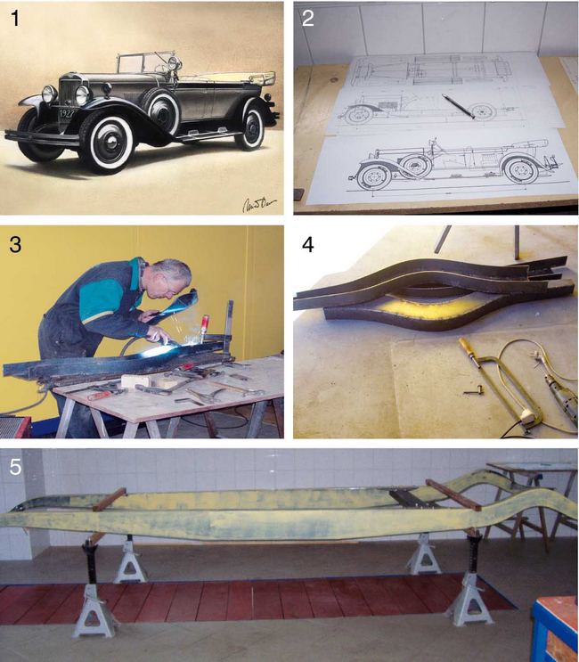 Podstawowym elementem konstrukcyjnym ówczesnych samochodów była rama, do której montowano mechanizmy podwozia, silnik i nadwozie. Od niej właśnie rozpocząłem prace rekonstrukcyjne. W CWS T-1 rama składała się z dwu kształtowych podłużnic, ustawionych zbieżnie i połączonych z poprzeczkami za pomocą nitów. Jej elementy ramy wykonywała z blach stalowych metodą kucia matrycowego Huta Batory z Hajduków Wielkich, a całość łączono w Centralnych Warsztatach Samochodowych w Warszawie. Matryce są oprzyrządowaniem zbyt kosztownym dla amatorskiej pracowni, więc profilowe podłużnice zespawałem z płaskich elementów wyciętych z blachy stalowej o grubości 4 mm. Tak wykonałem też główną poprzeczkę i wszystko to wstępnie skręciłem śrubami.
