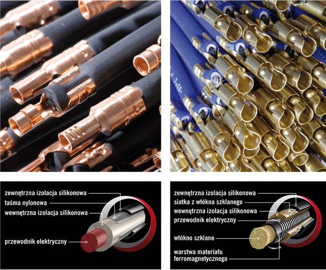 Przewody zapłonowe w izolacji silikonowej, z lewej: z rdzeniem miedzianym (lub węglowym), z prawej: konstrukcja typu wire wound