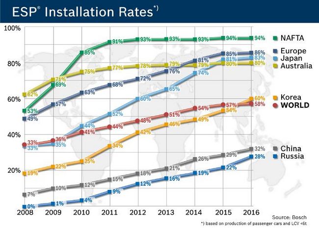 Właśnie ze względów bezpieczeństwa coraz więcej krajów nakazuje obowiązkowy montaż systemów ESP. W Unii Europejskiej dotyczy to już wszystkich pojazdów, które uzyskały homologację od października 2011 roku. Natomiast od listopada 2014 system ESP będzie montowany seryjnie we wszystkich nowych samochodach powstających na Starym Kontynencie. Obecnie w Europie 72 procent nowych aut osobowych i pojazdów użytkowych o mniejszym tonażu dysponuje systemem ESP. W skali świata odsetek ten wynosi 48 procent.