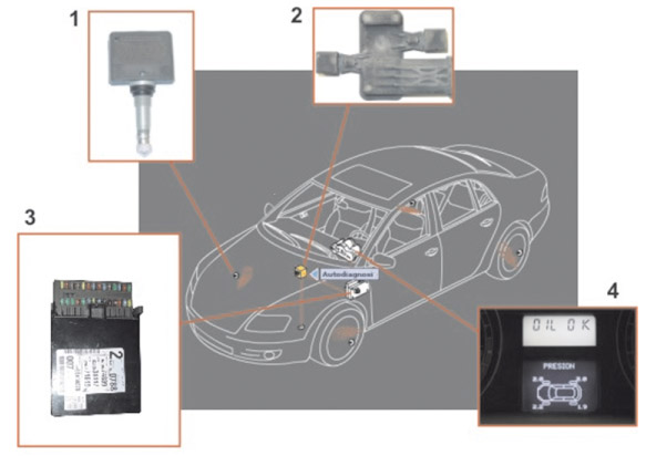 Samochodowy zespół monitoringu ciśnienia tworzą (1) cztery czujniki nanometryczne wbudowane w powietrzne zawory kół. Każdy z nich oznaczony jest kolorowym pierścieniem, pozwalającym identyfikować jego pozycję w pojeździe. Kolor zielony oznacza lewą stronę przedniej osi, żółty zaś – jej stronę prawą, czerwony – to lewa, a czarny – prawa strona osi tylnej. W samochodach Renault koło zapasowe nie ma czujnika ciśnienia.