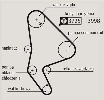 Pasek rozrządu napędza w tej konstrukcji dodatkowo pompę wysokiego ciśnienia systemu common rail i pompę obiegu chłodzenia. Aby osiągnąć optymalne parametry pracy paska, istotnym jest ustawienie właściwego napięcia instalacyjnego przy zachowaniu odpowiednich procedur montażowych.