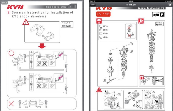 Graficzne instrukcje montażu amortyzatorów, z lewej: ogólne zasady postępowania, z prawej: szczegółowa procedura dla konkretnego modelu, fot. KYB