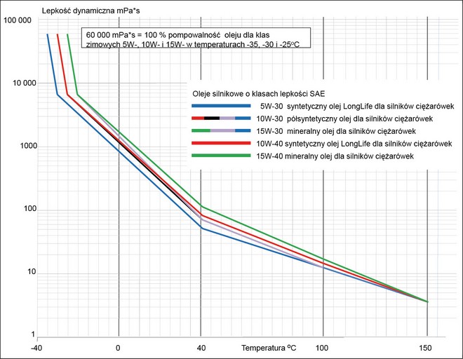 Załączony wykres wyjaśnia też, dlaczego z powodów ekologicznych i dla trwałości elementów silników Volvo i producenci amerykańscy preferują klasę SAE 10W-30, a Renault robi swój własny olej RTO 15W-30. Warto również pamiętać, że lepkość oleju nie świadczy o jego jakości, chociaż (jak to wynika z klasyfikacji SAE) wszystkie oleje muszą wytrzymywać temperatury w zakresie do 150°C, choćby ze względu na warunki testów. Wiadomo, że oleje o niskich lepkościach łatwiej jest produkować z baz syntetycznych, ale produkowane są także syntetyki o wysokich klasach lepkości SAE, np. 15W-50 czy 10W-60. Jako podstawowy syntetyk dla ciężarówek przyjął się olej SAE 10W-40, rzadziej stosowany jest 5W-30, półsyntetyki mają lepkości 10W-40 i 10W-30, a najpopularniejszy olej mineralny klasę 15W-40 (w USA 10W-30).