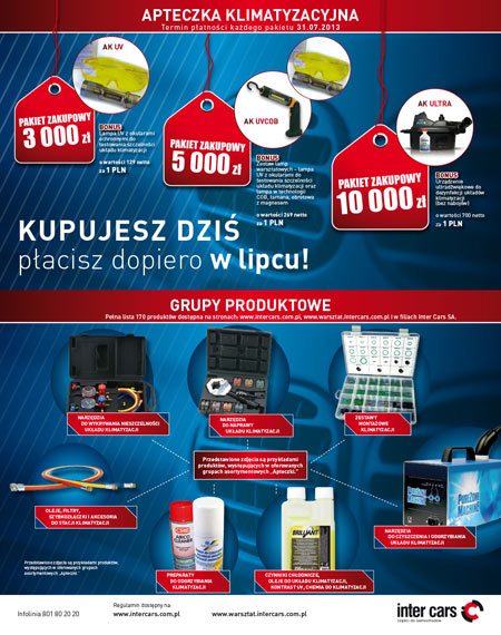 Firma Inter Cars rozpoczęła dwie promocje: Apteczka Klimatyzacyjna i Wiosenna Apteczka Lakiernicza. Obie akcje pozwalają uzupełnić zapasy przed sezonem wiosennym, zakupić przydatne narzędzia w promocyjnych cenach i skorzystać z odroczonego terminu płatności.