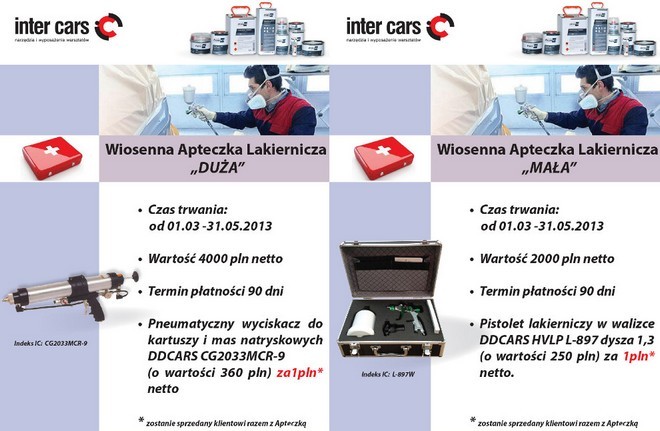 Promocja Wiosenna Apteczka Lakiernicza trwa od 1 marca do 31 maja 2013 roku. Klienci mają do wyboru apteczkę "dużą" lub "małą". W skład obydwu wchodzą lakiery, podkłady, utwardzacze, szpachle, rozcieńczalniki, środki do ochrony karoserii, papiery ścierne, krążki ścierne, gąbki ścierne, pasty polerskie i inne produkty przydatne w warsztatach blacharsko-lakierniczych.