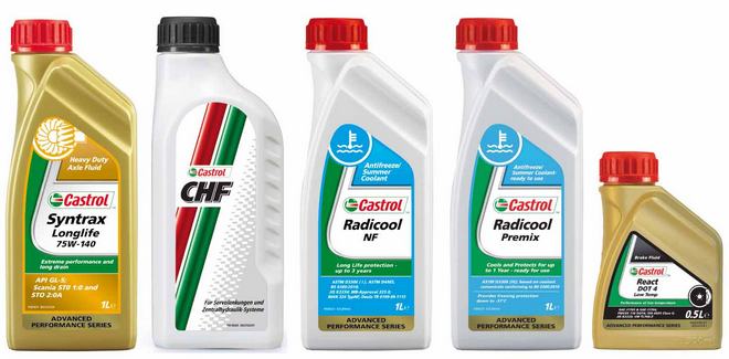 Przykłady specjalnych produktów eksploatacyjnych Castrol, od lewej: olej przekładniowy, płyn do hydraulicznych układów wspomagania, dwa rodzaje płynu chłodniczego i płyn hamulcowy