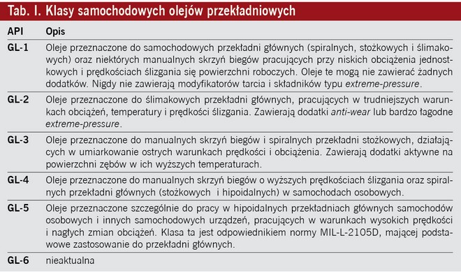 Okazało się, że do smarowania tylnych mostów napędowych z przekładniami hipoidalnymi potrzebny jest olej przekładniowy o lepkości wyższej niż w przypadku skrzyń biegów i powinien on zawierać więcej dodatków chroniących smarowane części przed zużyciem. Zazębienia te bowiem odznaczają się większym obciążeniem zębów w stosunku do ich roboczej powierzchni. Dla prawidłowego serwisowania samochodów konieczne stało się więc wprowadzenie jakościowych i lepkościowych klasyfikacji samochodowych olejów przekładniowych. Dokonał tego Amerykański Instytut Naftowy API (American Petroleum Institute) i przedstawił wymagania dotyczące olejów przeznaczonych do różnych typów przekładni. Klasyfikację tę objaśnia tabela I.