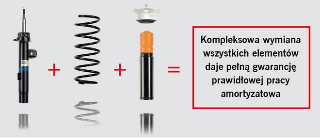 O obowiązku jednoczesnej wymiany obu amortyzatorów tej samej osi, a jeszcze lepiej całego kompletu w pojeździe, nie trzeba już chyba fachowcom przypominać. Dodatkowo jednak firma Bilstein zaleca, by z uwagi na specyfikę pracy wszystkich części kolumny McPhersona wymieniać też przy tej okazji sprężyny zawieszenia, zestawy osłon z odbojami oraz górne poduszki amortyzatorów.