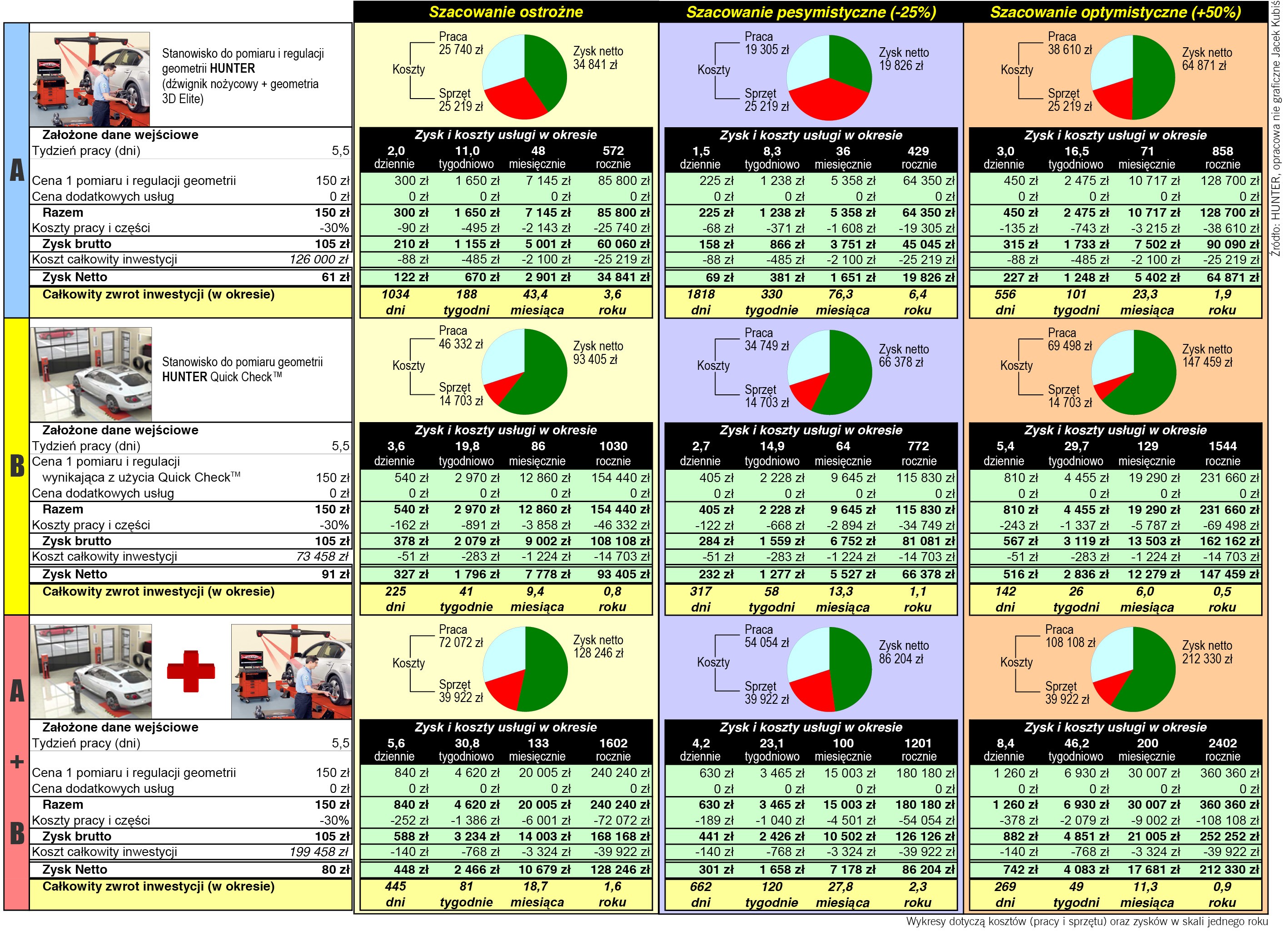 Zakup nowoczesnego kompletnego stanowiska do geometrii kół (dźwignik nożycowy diagnostyczny + urządzenie do geometrii kół Hunter 3D HawkEye z multimedialnym programem WinAlign w środowisku Windows 8 kosztują razem: 126 000 zł netto albo najtańsze urządzenie Hunter 3D z dźwignikiem 4-kolumnowym – w sumie ok. 72 000 zł netto). Oszczędność inwestycyjną uzyskuje się jednak kosztem wygody, miejsca w warsztacie, szybkości pracy i prestiżu warsztatu.