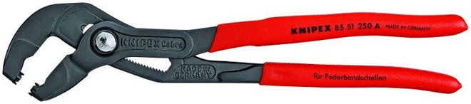 Narzędzie jest przeznaczone głównie do prac w przemyśle motoryzacyjnym, przy urządzeniach AGD i maszynach przemysłowych. Model Knipex 85 51 250 A służy do montażu i demontażu różnego rodzaju opasek i obejm zaciskowych używanych przy końcówkach i złączach węży przemysłowych. Szczypce mogą być stosowane do najbardziej popularnych opasek i obejm Mubea, Mikalor oraz opasek innych producentów.