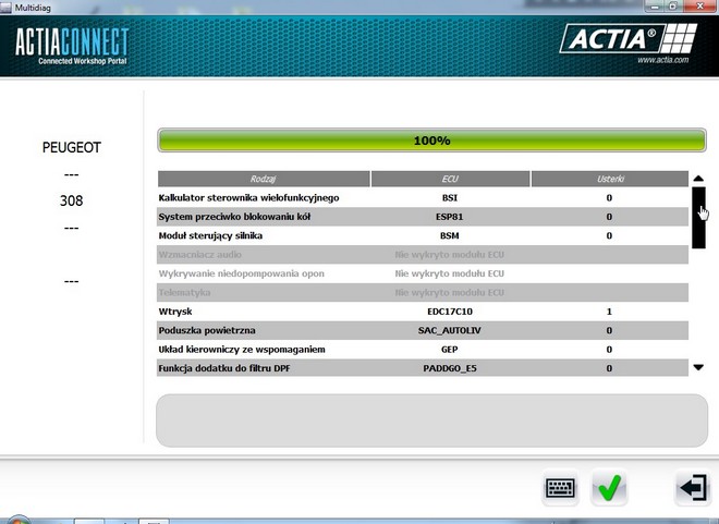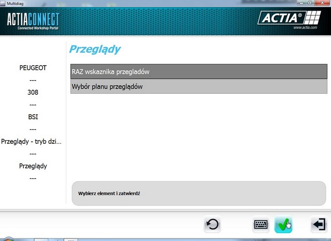 Urządzenie Multi-Diag firmy Actia poprzez odpowiednio rozwinięte oprogramowania już od lat pozwala na przeprowadzanie takich operacji warsztatowych. Mechanik nie musi "zgadywać", czy kasowanie inspekcji odbywa się poprzez wykorzystanie sterownika licznika, czy też jest realizowane przez elektroniczny sterownik silnika ECU (electronic control unit), systemu nadwozia BCU (body control unit), BSI, UCH itp. Wybór ikony Obsługa pozwala na bezpośrednie przeprowadzenie wszelkich czynności inspekcyjnych – bez konieczności ich poszukiwania w sterownikach samochodu.
