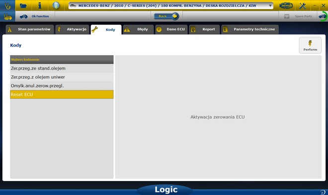 Widok ekranu testera diagnostycznego Magneti Marelli podczas kasowania inspekcji serwisowej