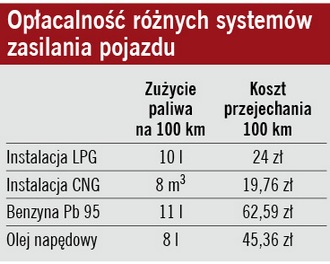 Przy aktualnych cenach paliw zdecydowanie najniższe koszty eksploatacji generuje pojazd wyposażony w instalację CNG. Różnica kosztów paliwa, w porównaniu z pojazdem zasilanym benzyną, jest ponad trzykrotna. W pojeździe z instalacją LPG koszt paliwa jest niewiele wyższy. Na korzyść tego wariantu przemawia z kolei łatwiejsza dostępność LPG, zwłaszcza przy przejazdach długodystansowych. W całej Polsce działają bowiem obecnie tylko 23 stacje tankowania CNG.