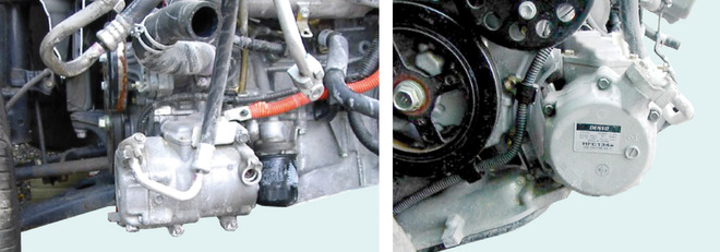 Sprężarka klimatyzacji w pojeździe hybrydowym to zespół dwóch bliźniaczych urządzeń, jedno z napędem elektrycznym, drugie z mechanicznym