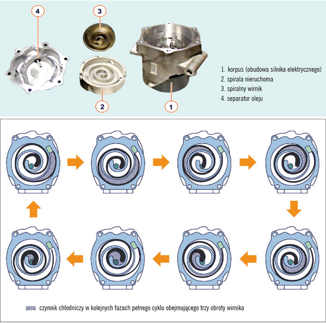 Podstawowe elementy (u góry) i zasada działania sprężarki ślimakowej (u dołu)