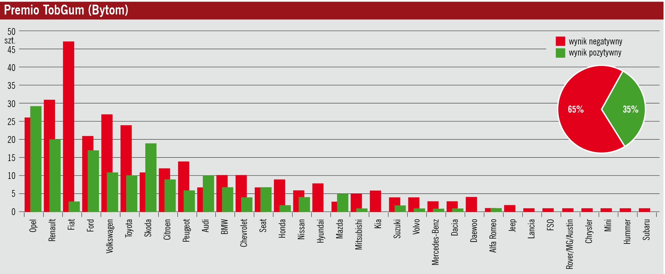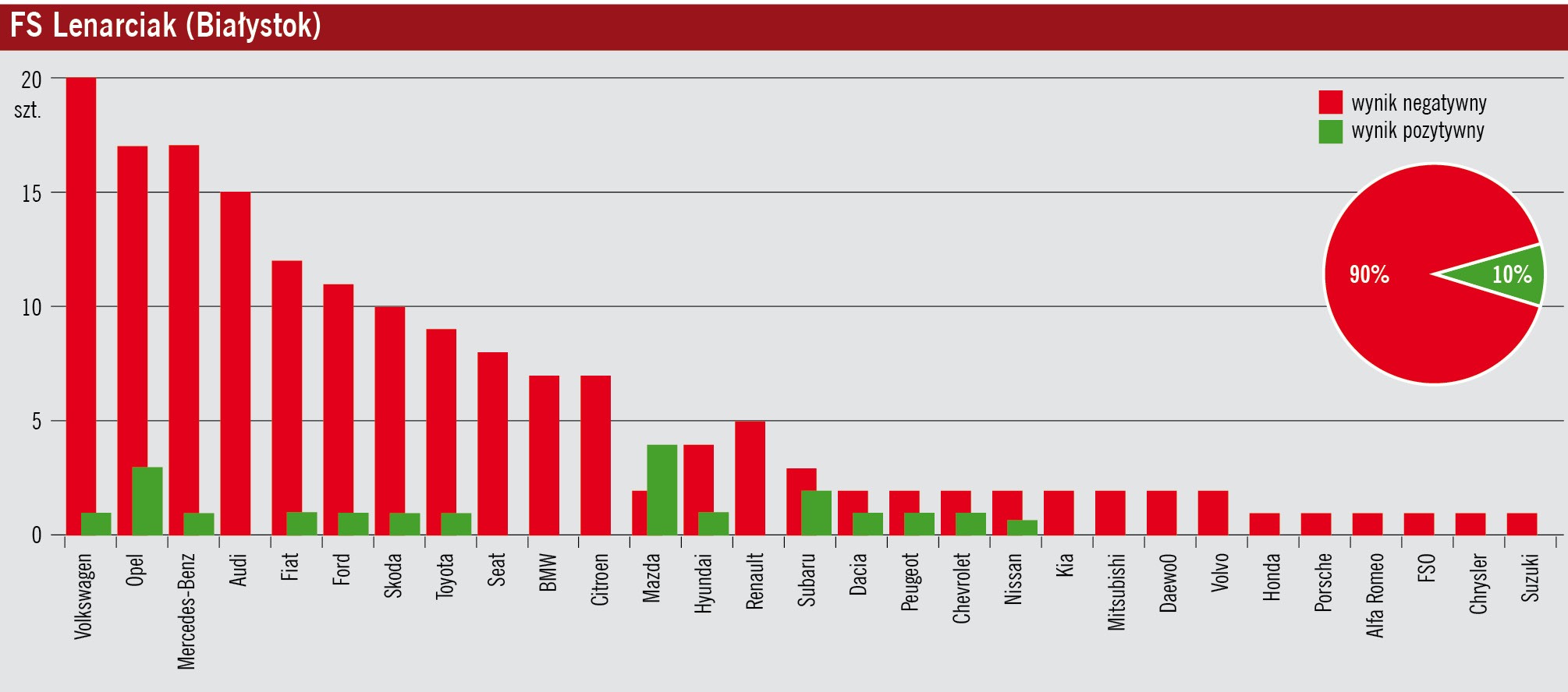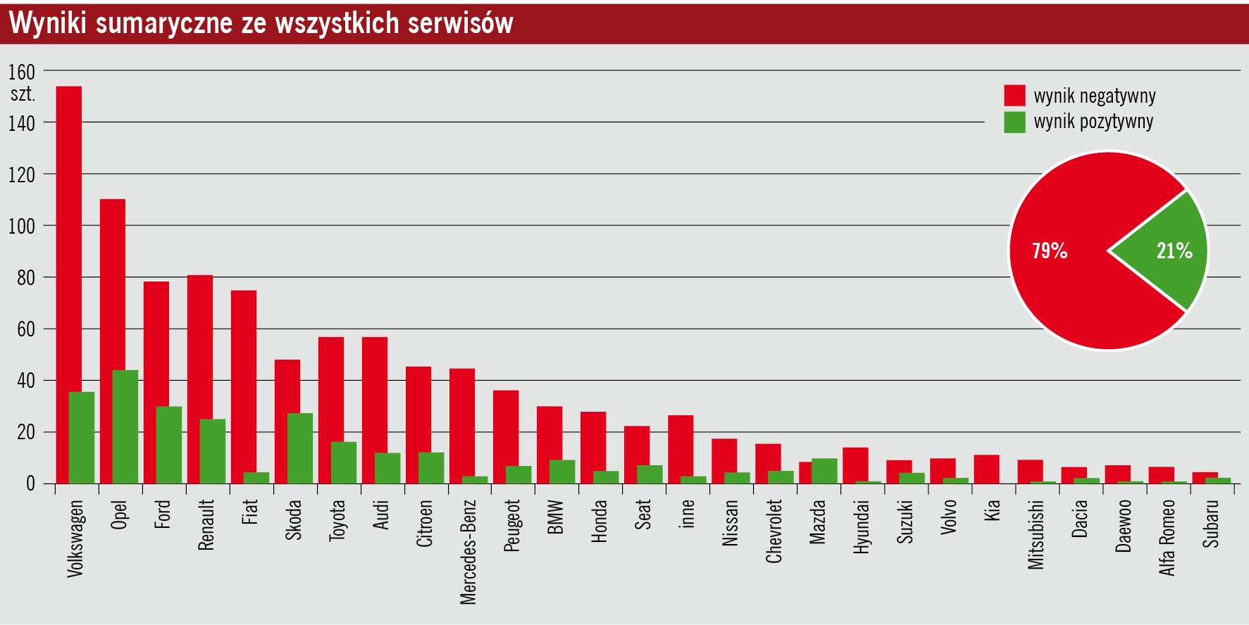 Oczywiście otrzymane wyniki nie charakteryzują precyzyjnie ogólnej sytuacji w kraju, lecz wiele mówią o powadze i skali problemu. Daje się w nich też zauważyć pewna lokalna specyfika. Na przykład w trzech serwisach z północy Polski dominowały używane samochody marek niemieckich sprowadzone zza granicy i dopuszczone do ruchu w Polsce przez lokalne SKP. Ich średni stan nie jest już zły, ale wręcz fatalny. Z kolei w Bytomiu na strukturę przebadanej próby zdaje się wpływać terytorialna bliskość fabryk Fiata, ale wyniki i tu nie są lepsze. Jeszcze bardziej zadziwia stan pojazdów grupy Volkswagen przebadanych u jej autoryzowanego dealera, czyli u niego obsługiwanych i w znacznej części tam też kupionych. Stosunek samochodów sprawnych do ogółu skontrolowanych wyniósł 16:40 dla VW i 2:13 dla Audi.