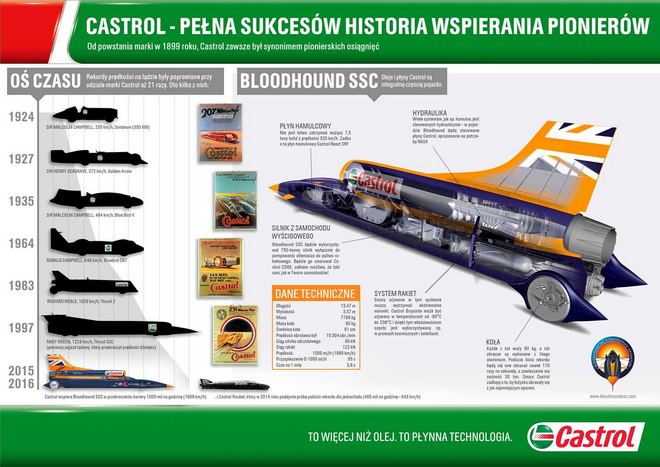 Andy Green ustanowił również w 1997 roku dotychczasowy rekord, wynoszący 763 mile na godzinę (1228 km/h), co wymagało przekroczenia bariery dźwięku. Obecnie planuje osiągnięcie prędkości 1000 mil na godzinę (1609 km/h) na dwudziestokilometrowym pasie pustynnej równiny w południowej Afryce. Jest to zamierzenie w pełni realne, ponieważ Bloodhound SSC dysponuje mocą 135 000 KM, a pomoc Castrola nie ogranicza się wyłącznie do finansowego wsparcia. Firma ta jest zaangażowana w ustanawianie i bicie rekordów prędkości od 100 lat. Rekordowy wynik z 1914 roku wynosił 200 km/h. W sumie aż 21 razy najszybsze na świecie okazywały się pojazdy smarowane olejami Castrola. W pojeździe Bloodhound SSC także szeroko wykorzystane są także najnowsze produkty tej marki, m.in. olej Castrol EDGE Titanium FSTTM, używany w sportach motorowych płyn hamulcowy React SRF i inne płyny, stosowane m.in. przez NASA.